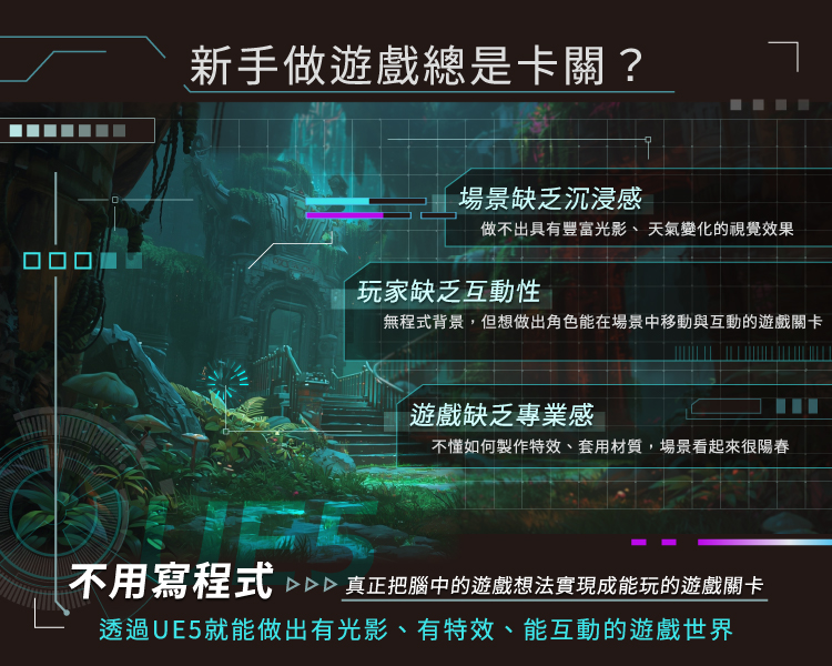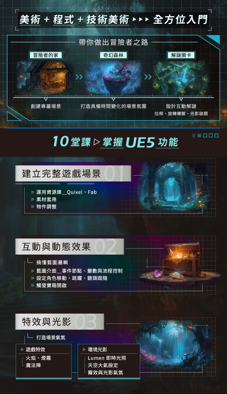 想像一下,如果腦中出現的奇幻城堡、神秘森林或科幻城市,可以立刻變成能走進去探險的 3D 世界,會有多酷!而虛幻引擎 5(UE5)可以讓每個人都能做到這件事,不論是喜歡畫圖、喜歡寫程式,還是單純愛玩遊戲的你,本課程都會帶你從玩家變成創作者,把想像變成現實。