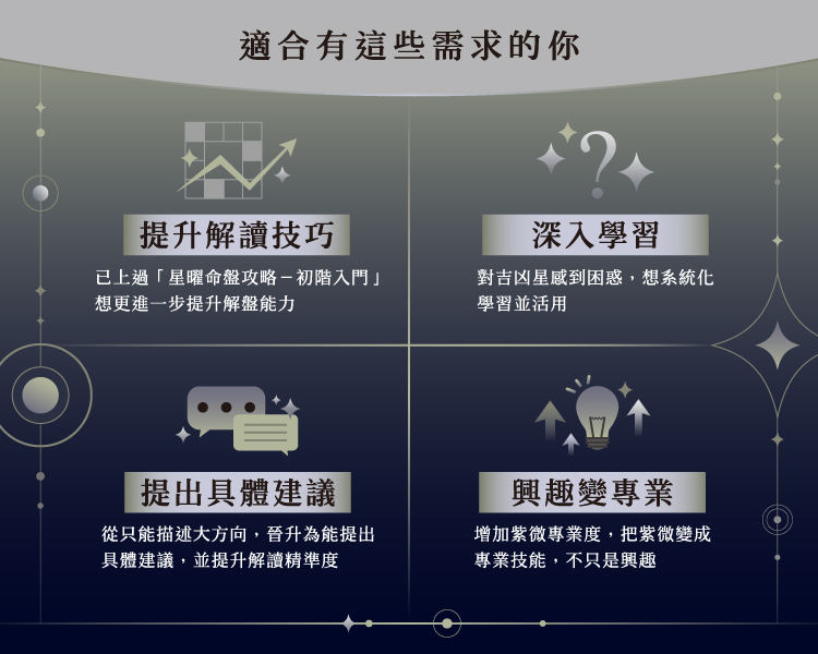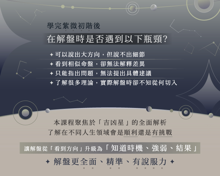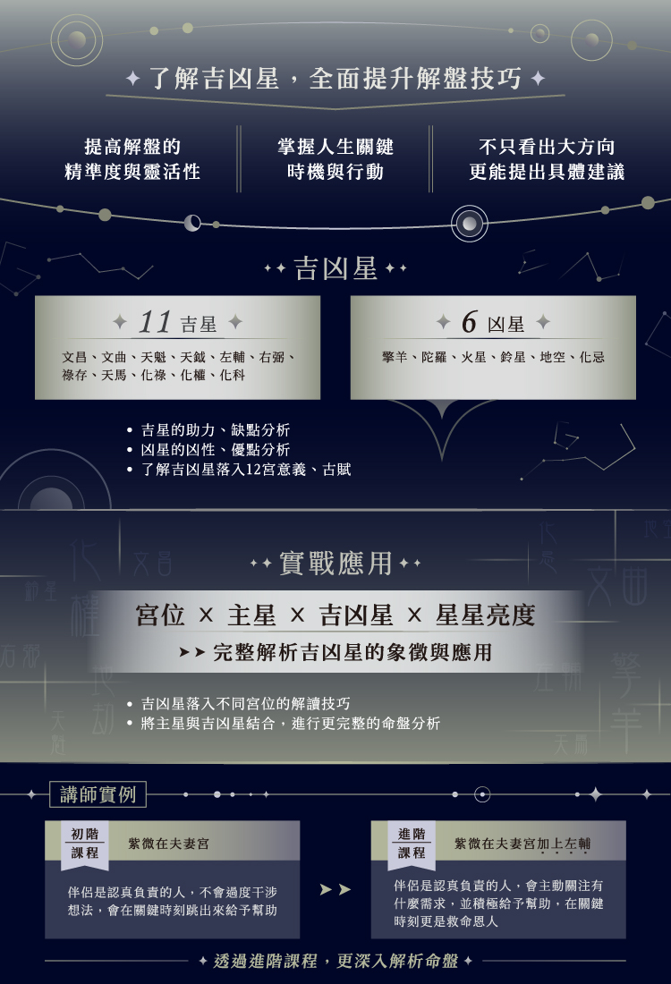 本次進階課程特別聚焦於「吉凶星的全面解析」,能獨立判斷運勢吉凶,全面掌握紫微斗數看盤核心技巧。